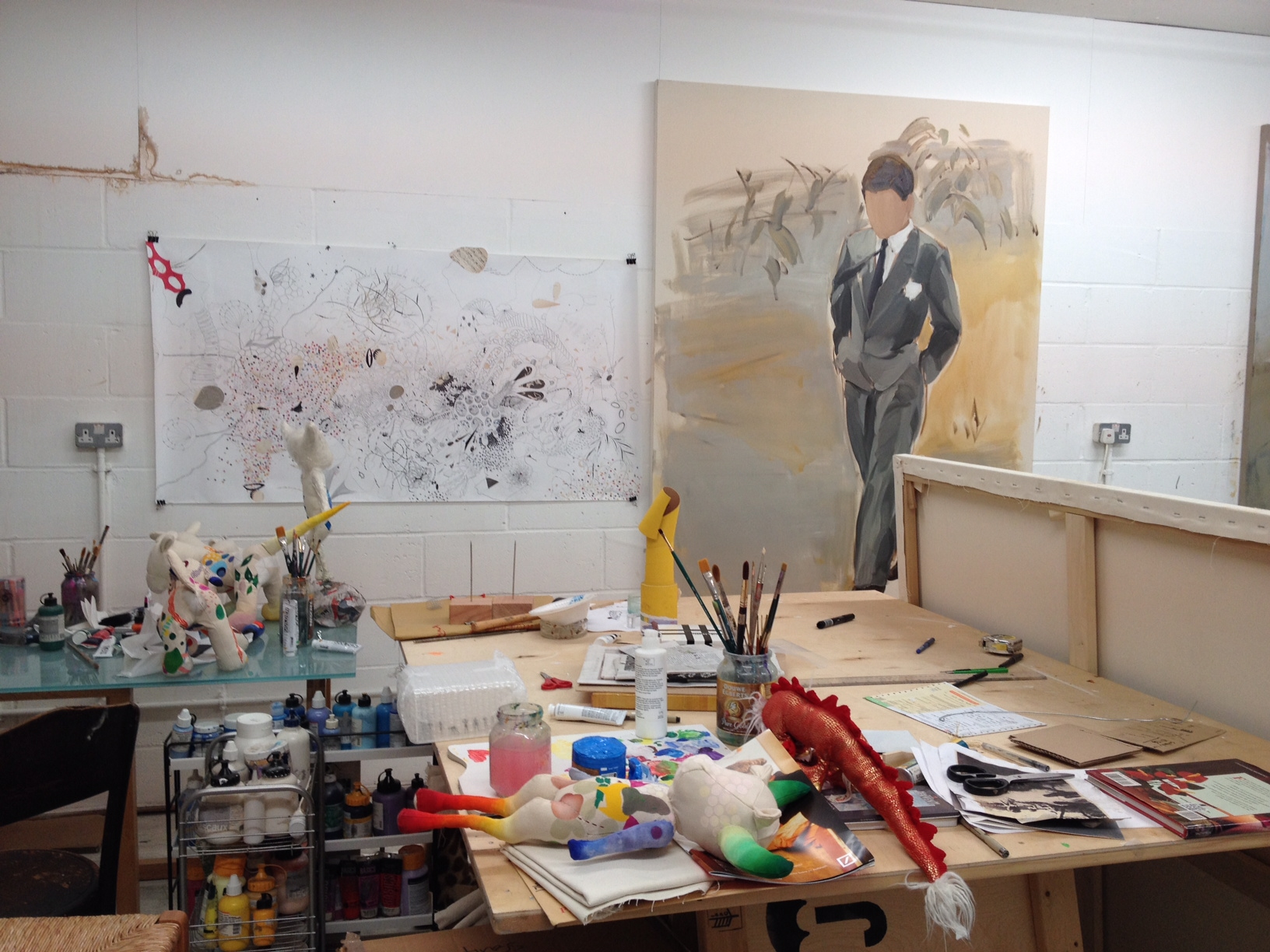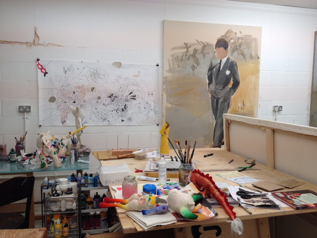 גידי רובין הוא אמנם “הנכד של” אבל עבודותיו כבר מזמן עומדות בזכות עצמן. גידי חי ויוצר בלונדון ומציג בכל רחבי העולם בעיקר פורטרטים חסרי פנים. אנחנו תפסנו אותו בהכנות לתערוכה חדשה שתעלה בסן פרנסיסקו בעוד כמה חודשים. כששאלתי אותו, למה הוא לא מצייר תווי פנים, הוא ענה בפשטות: “כי גיליתי שהם פשוט לא תורמים לציור”. ביקור בסטודיו של אמן הוא תמיד מרגש מבחינתי, בגלל שהוא מספק הצצה לא רק לתהליך היצירה המרתק שבו נוצרת אמנות יש מאין, אלא גם הצצה לתוך נשמתו של האמן. ואכן היה מרגש.