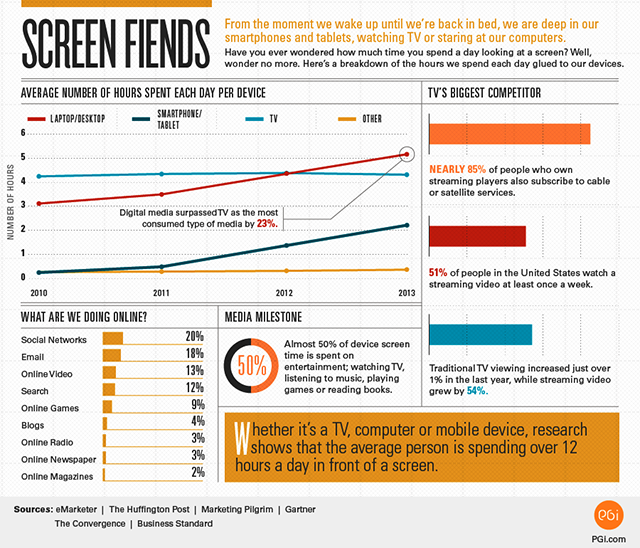 מחקרים מראים כי משך השהייה הממוצע של אדם מערבי מול מסכי הטלוויזיה, המחשב, הטלפון, האייפד, האייפון, וכו’ נאמד כיום ב־12 שעות ביום!!!!
