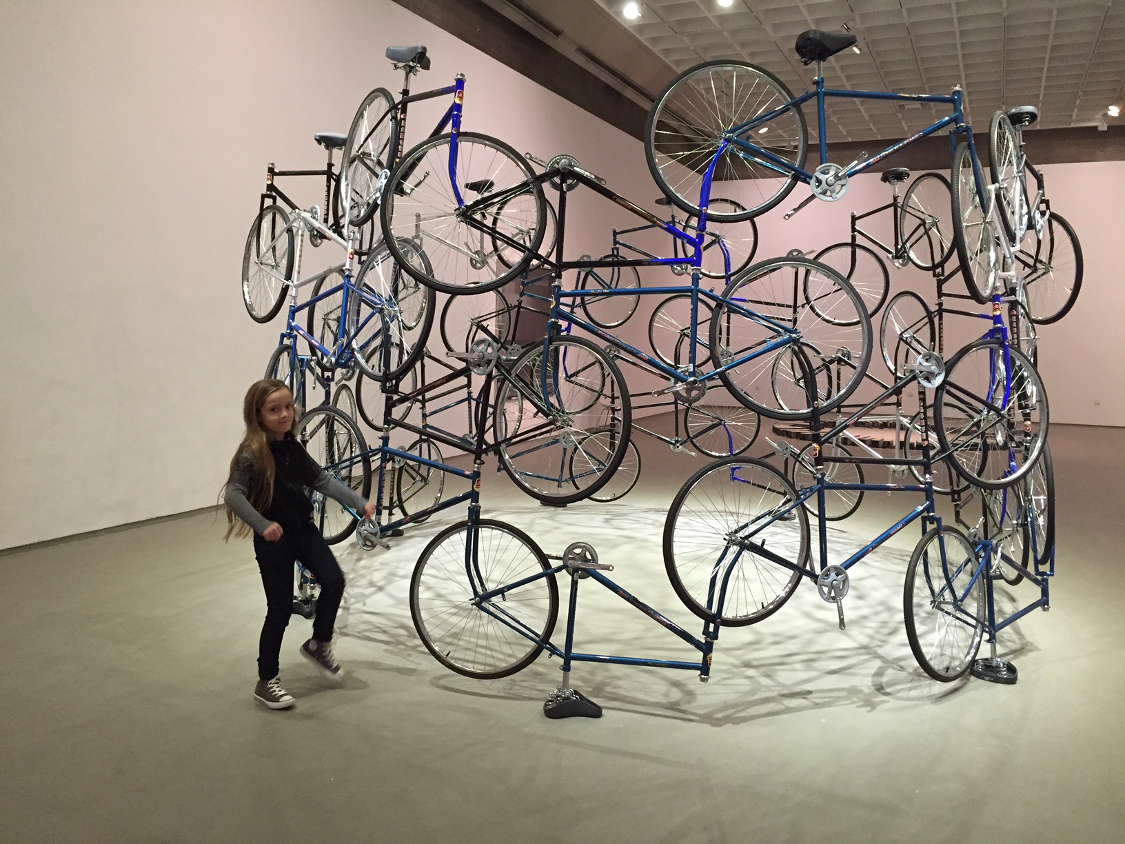 המון עבודות חדשות נוספו לאוסף האמנות המודרנית והחלל באמת נראה כמו מגרש משחקים ענק. עץ עשוי מעץ, מיצב האופניים של איי ווי ווי, החור השחור התלוי על הקיר, השטיח שאפשר לשכב עליו, ביחד מייצרים עולם שלם להתרוצץ בו ולגלות אותו. חבל שכבר היינו יותר מדי עייפות.