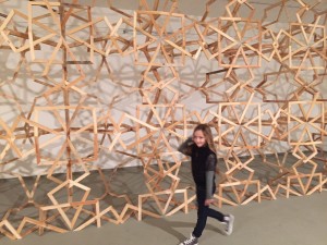 באולם שליד תערוכת הילדים מציג מחמוד קייס מיצב ענק מעץ שעוסק כהרגלו ביחסי תרבות המערב עם תרבות האסלאם ובשאלות הנוגעות למצבי הזדהות, שייכות ותלישות. קייס משתמש בערבסק, צורת עיטור גאומטרי טיפוסית באיסלאם בעלת מאפיינים קבועים של סימטריה, צבעוניות עזה, כיסוי מלא של המשטח וחזרתיות אינסופית, ומייצר ממנה קיר עצום ומדהים תוך שהוא מתכתב עם המופשט המערבי, עם אמנות הרדי-מייד ועם מיצבים תלויי מקום. ואנחנו באמת התפעלנו מהגודל, מהחזרתיות, מהעוצמה, ומהאפשרות לגלות עוד ועוד צורות בתוך המבנה. וגם מהעובדה שמותר להסתובב סביב העבודה כולה, גם מאחוריה, להציץ מתוכה, ולהרגיש את תלת המימד שבה. וכן, גם להצטלם.