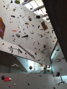 המיצג/מובייל של טום פרידמן כאילו נבנה במיוחד לילדים. זהו המיצב השלישי שהותאם במיוחד למפל האור בבניין החדש והוא מורכב מ- 900 פריטים שתלויים מהתקרה, ויוצרים מובייל ענק של חפצים קטנים שמרכיבים את היוםיום של כולנו. הכי הכי כייף להסתובב סביב מפל האור ולגלות בזויות שונות עוד ועוד חפצים. “אמא, הנה שקית צ’יפס של מקדונלד, וברבי שבורה, ומעל הפסנתר את רואה רקטת טניס, וכוכב משונה עם קוצים?” בתוכנייה כתוב שלמרות שהם נראים כאילו נאספו מהבית, בעצם מדובר בחפצים שנוצרו בעבודת יד שקדנית וסבלנית, והסתכלות יותר מדוקדקת מגלה גם נגזרות נייר של מאטיס, פסל של ג’ף קונס, קוביות של סול לוויט, פרפר של דמיאן הירסט ועוד. אז ניסינו לגלות את האמנות המסתתרת מאחורי משקפי השמש הסגולות ובינתיים נהננו עד הגג או יותר נכון עד המרתף.