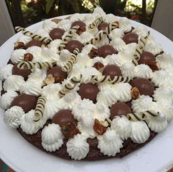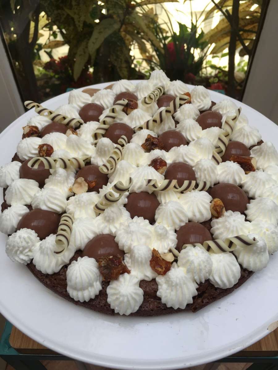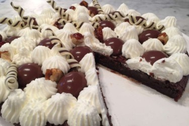 עוגת שוקולד בראוני עם קצפת, טראפלס ואגוזים מקורמלים.
