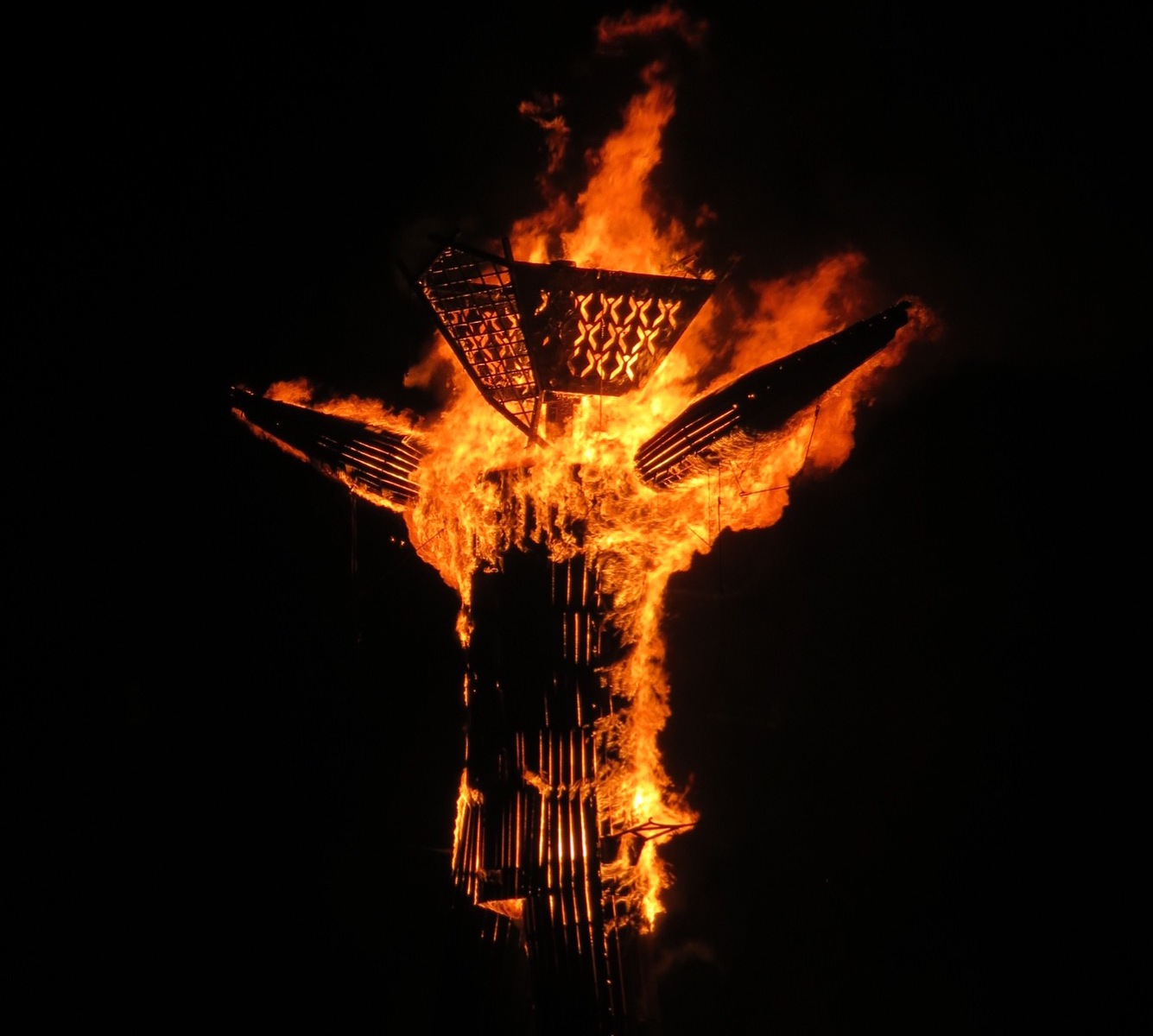 שורשיו של הפסטיבל נעוצים בקיץ 1986, שבו יצאו לארי הארווי וקומץ חברים לחוף בייקר בסן פרנסיסקו, ושרפו בו דמות אדם בגובה של כמעט 3 מטרים. השריפה הוסברה על ידם כאקט ספונטני של ביטוי עצמי רדיקלי, והפכה למסורת. בשנת 1991 הועברה למדבר נבדה, אחרי שהחוף לא הצליח להכיל את כמות המשתתפים ועיריית סן פרנסיסקו אסרה על קיומו במתכונת המקורית.