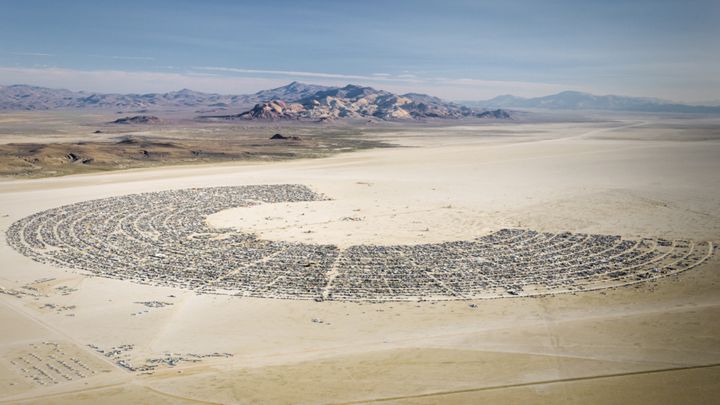 השטח בו מתרחש הפסטיבל הוא אגם שהתייבש והשאיר אחריו מישור חול אבקתי לבן והוא מכונה “פלאייה”, חוף בספרדית, והוא מועד לסופות חול ואבק רבות וקשות. במסגרת הפסטיבל מוקמת עיר זמנית הנקראת “Black Rock City”, הבנוייה בצורת אמפיתיאטרון, כאשר אזור הקהל הוא האזור שבו גרים המשתתפים, ואזור הבמה הוא ה”פלאיה”, אזור עגול וענק שבו מתקיימים הארועים הגדולים, ובו ממוקמים מיצבי האמנות, המקדש, וגם כמובן “האיש הבוער”, שעומד המרכז הפלאיה ומהווה מעין מגדלור ומצפן.
