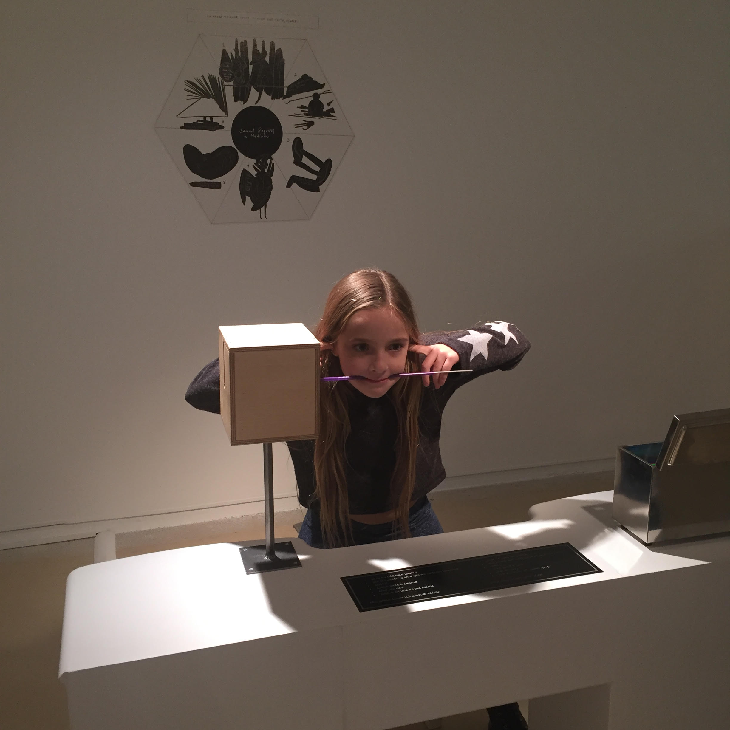 רק אחרי שהבטחתי להם שאקח אותם “לשמוע” דרך השיניים, הם הסכימו לעזוב את החדר ולעלות קומה, כדי לפגוש מכונה פשוטה להפליא שבנתה מאיה – קופסת עץ שאליה מחובר מוט מתכת, שאם נוגסים אותו, שומעים מוזיקה! דרך הגוף ולא דרך האוזניים. חוויה מופלאה.