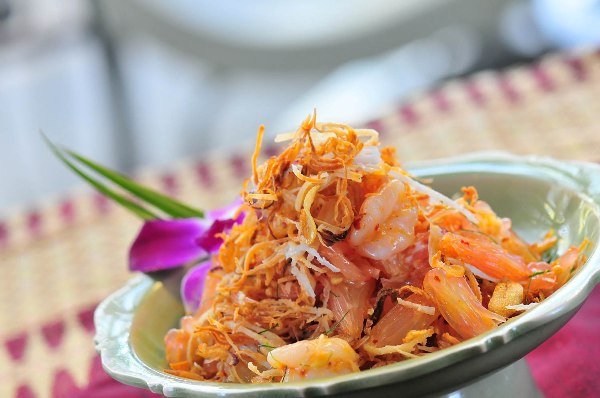 - שמים בקערה את חתיכות הפומלה המפוררות, השרימפס טמפורה, אגוזי קשיו, עלי קפיר ליים, בצל י שאלוט מיובשים, קוקוס מיובש וצ’ילי אדום.