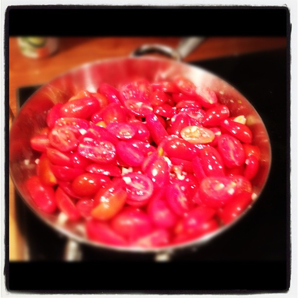 4. מגבירים להבה ומוסיפים עגבניות אדומות חצויות וחורכים תוך כדי מעיכה, במשך 4-3 דקות.