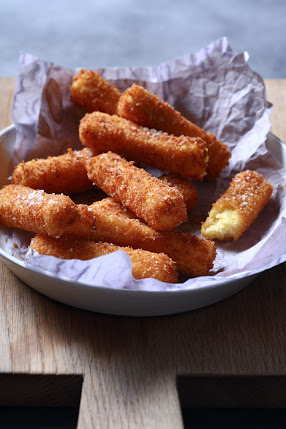 4. חותכים את הפולנטה למלבנים, מצפים כל אחד בביצה טרופה, בקמח ובפנקו ומטגנים בשמן עמוק עד שמזהיב.
